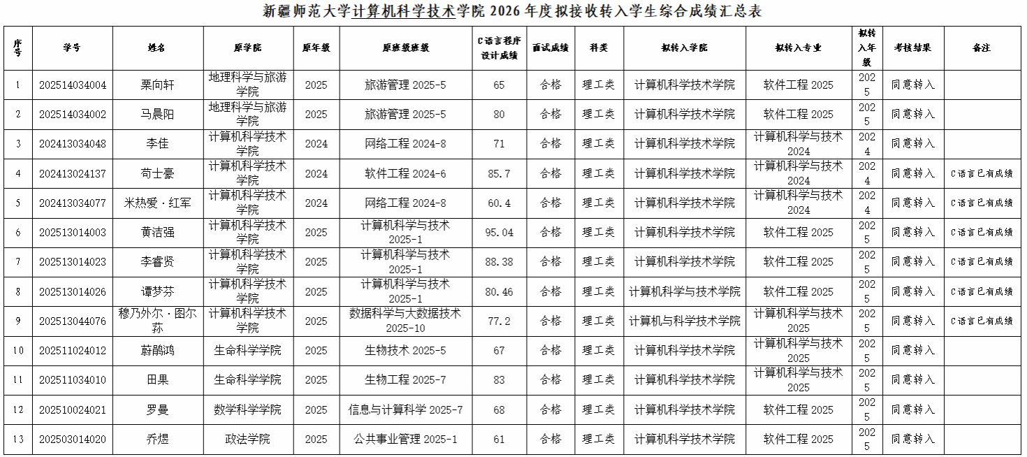 根据教育部令第41号及《性爱小说 普通本、专科学生转专业实施细则》的相关规定,按照我校2026年度普通本、专科学生考试(考核)转专业整体工作安排,经学院考核,现将拟接收转入学生名单公示如下: