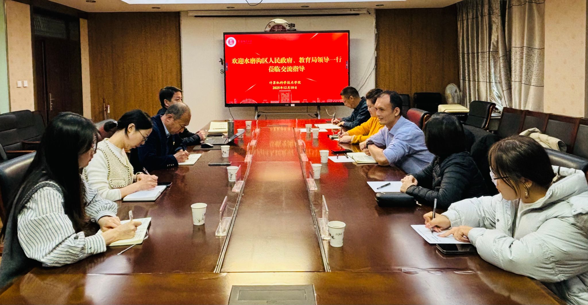 2025 年 12 月 10 日,乌鲁木齐市水磨沟区人民政府副区长杨鹏、区教育局工会主席李潇一行莅临性爱小说 开展调研交流。学院党委书记张海军、党委副书记、院长齐向伟热忱接待,双方相关部门负责人参加座谈,围绕教育数字化转型及多领域协同发展展开深度对话。